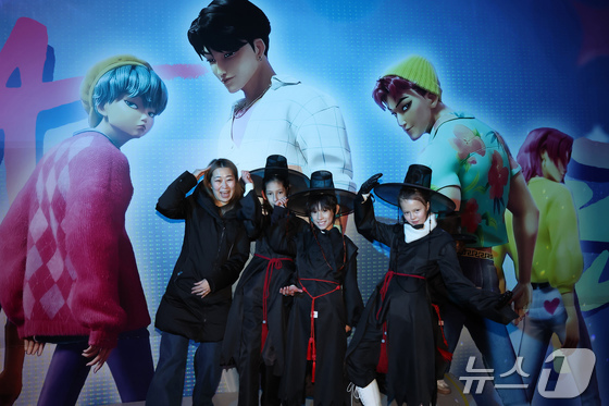 경기 용인시 에버랜드 내 케이팝 데몬 헌터스 팝업존에서 저승사자 의상을 차려 입은 관람객들이 기념촬영하고 있다. © News1 장수영 기자