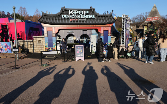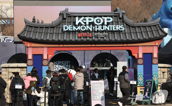 경기 용인시 에버랜드 내 케이팝 데몬 헌터스 팝업존을 찾은 관람객들이 입장을 위해 줄을 서고 있다. © News1 장수영 기자