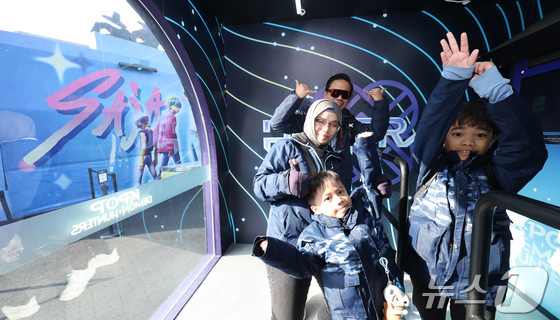 경기 용인시 에버랜드 내 케이팝 데몬 헌터스 팝업존을 찾은 외국인 관람객들이 컨텐츠를 즐기고 있다. © News1 장수영 기자