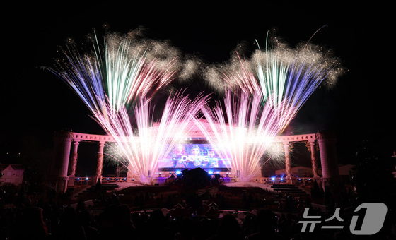 경기 용인시 에버랜드에서 케이팝 데몬 헌터스를 주제로 불꽃놀이가 펼쳐지고 있다. © News1 장수영 기자