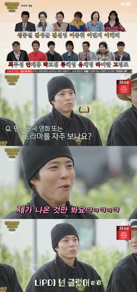이어 박보검에게 그는 “평소에 한국 영화, 드라마 많이 보냐”라고 기습 질문을 던졌다. 박보검은 쉽게 입을 떼지 못했고, 나영석 PD는 “넌 글렀어”라고 타박했다.
