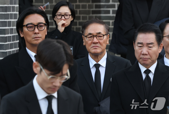 국민배우 이순재가 91세를 일기로 별세한 가운데, 27일 오전 서울 송파구 아산병원에서 열린 영결식에서 동료 연예인들이 애도하고 있다. 이순재는 지난해 연극 '고도를 기다리며를 기다리며'를 마지막으로 활동을 중단하고 건강 악화로 재활 치료를 받던 중 사망 소식을 전해 안타까움을 자아내고 있다. (공동취재) 2025.11.27/뉴스1 © News1 김명섭 기자