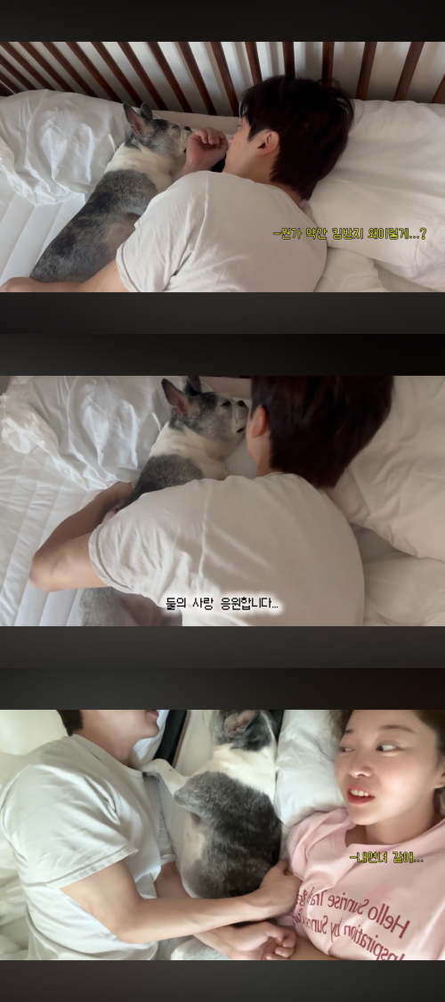 김가은은 침대에 다가가 “뭐해?”라고 물었고, 반응이 없자 “둘이 뭐하냐고?”라고 한 번 더 말을 건넸다. 잠결에 답한 윤선우는 “꽁냥꽁냥”이라고 말해 웃음을 자아냈다. 곧 포옹의 상대가 두 사람의 반려견 뭉찌라는 사실이 드러났다.