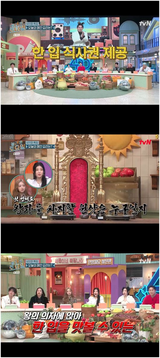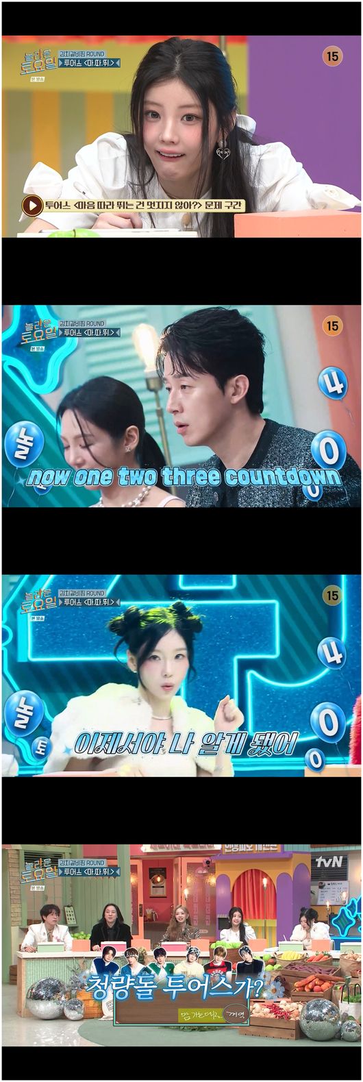 이어 받쓰 게임에서는 투어스 - ‘맛따뛰’(마음에 따라 뛰는 건 멋지지 않아)가 등장했다. 입짧은 햇님이 하차한 이후 비어있는 그 자리는 새로운 룰로 역할이 바뀌었다. 붐은 “오늘부터 ‘받쓰’ 원샷을 받는 분은 저 의자에 앉아서 한 입 식사를 할 수 있는 ‘한입 식사권’을 드린다”라고 말했다. 원희는 "내가 그 자리에 앉는 건가?"라며 설렘을 드러냈다.