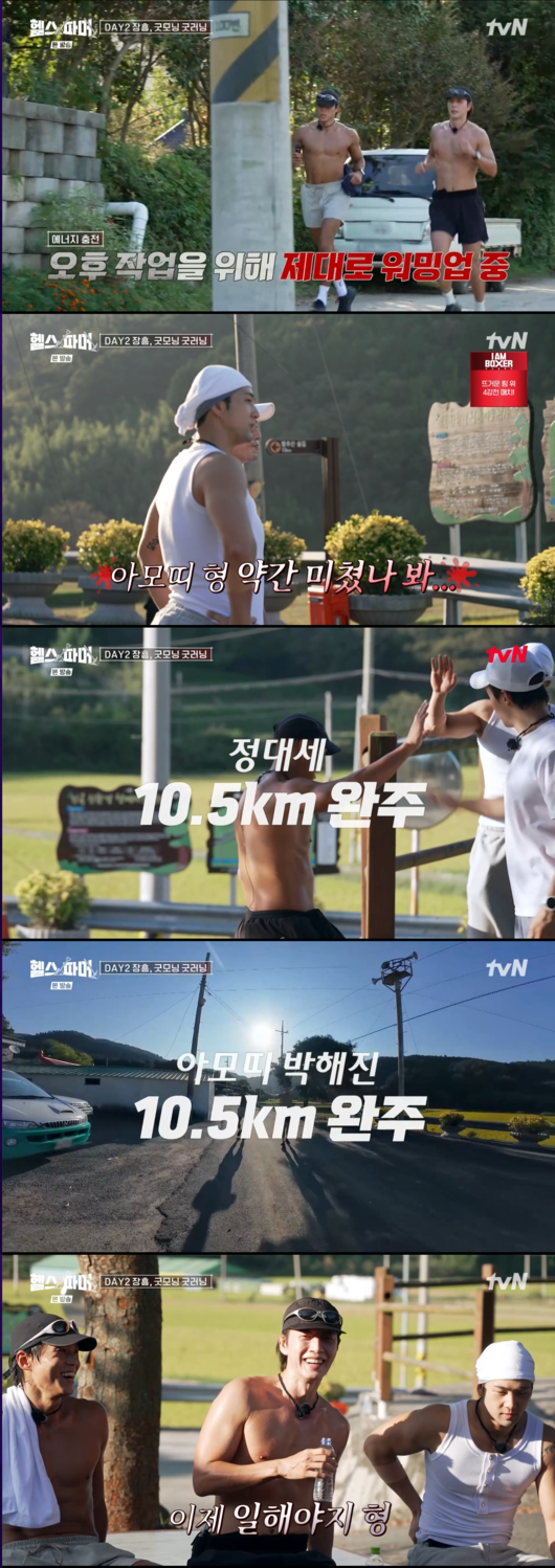 함께 뛰던 허경환이 6km를 완주한 가운데, 정대세와 아모띠, 그리고 배우 박해진은 본격적으로 상의를 탈의하고 달리기 시작했다. 거침없는 기세로 논밭을 가로지르는 이들의 남다른 체력에 백호는 “아모띠 형 미쳤나 봐”라며 혀를 내둘렀다.