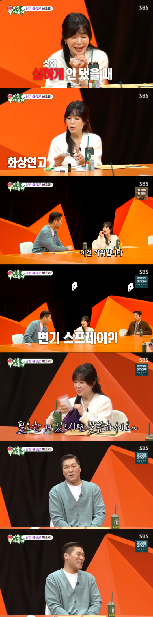 하희라는 “없을 때 꼭 찾을 일이 많아 가지고 다닌다. 주변 분들은 뭐가 없으면 다 저한테 온다”며 남다른 준비성을 과시했다. 이에 MC 신동엽은 평소 깔끔하기로 유명한 서장훈에게 “평소 이런 변기 스프레이를 챙기느냐”고 질문을 던졌다.