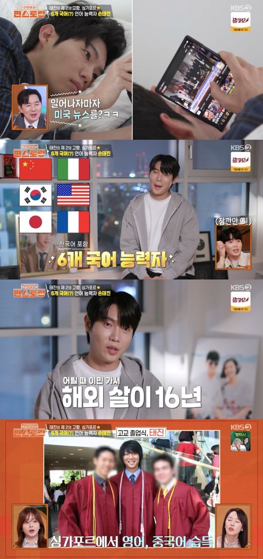 서울대 성악과 출신인 손태진은 일상부터 남달랐다. 알람 소리에 일어난 그는 눈을 뜨자마자 휴대폰을 통해 한글 자막 없이 미국 뉴스를 시청했다. 심지어 2배속으로 보던 그는 프랑스 뉴스, 중국 뉴스까지 시청해 놀라움을 안겼다.