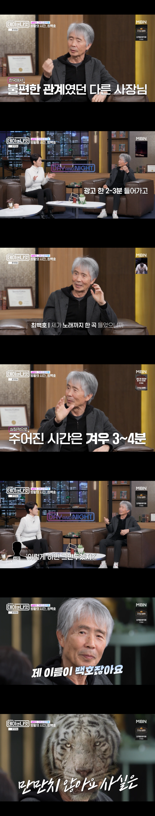 그러나 최백호는 좌절 대신 다른 선택을 했다. 그는 “아마 그렇게 하면 내가 포기할 거라고 생각했을 것”이라며 “그런데 내 이름이 백호 아니냐. 만만치 않다”고 웃었다. 이어 “10분이라는 시간이 오히려 부담이 없어서 더 즐겁게 방송할 수 있었다. 짧아서 오히려 좋았다”고 긍정적인 태도를 보였다.