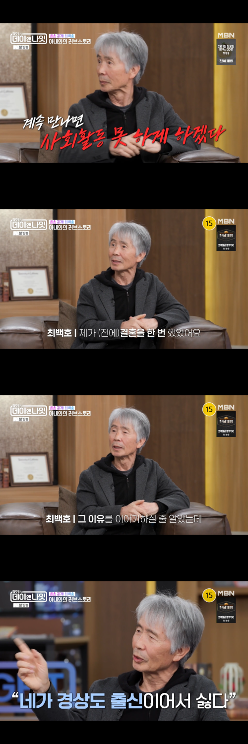최백호는 처음에는 자신의 이혼 경력 때문에 반대가 심한 줄 알았지만, 이유는 달랐다고 밝혔다. 그는 “알고 보니 경상도 출신이라는 이유가 컸다”며 “그래서 부산에 내려가 살겠다고 했더니 아내가 나를 따라왔다”고 말했다. 결국 두 사람은 결혼에 골인했지만, 결혼식에는 장인어른이 참석하지 않았고 장모님만 자리를 지켰다고 전했다.