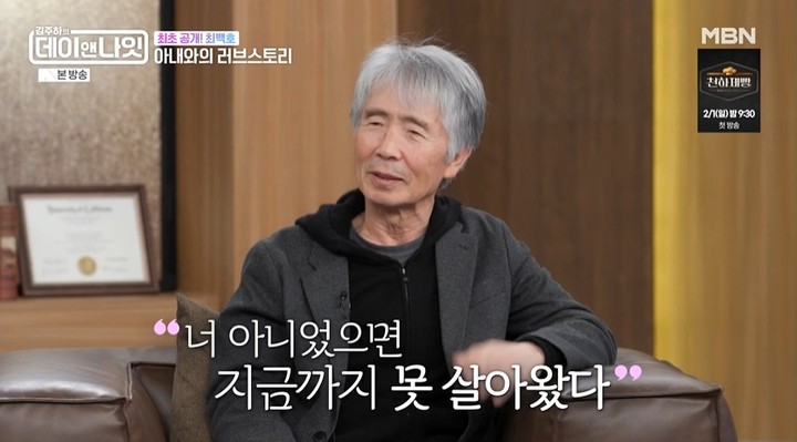 17일 방송된 MBN 예능 '김주하의 데이앤나잇'에는 올해 데뷔 50주년 맞은 가수 최백호가 게스트로 출연했다. 이날 최백호는 "이태원에서 노래하고 있었는데 친한 지인이 부인과 또 다른 여성을 데리고 왔다. 지인 부인의 처제라고 하더라"라며 아내와의 첫만남 당시를 떠올렸다.