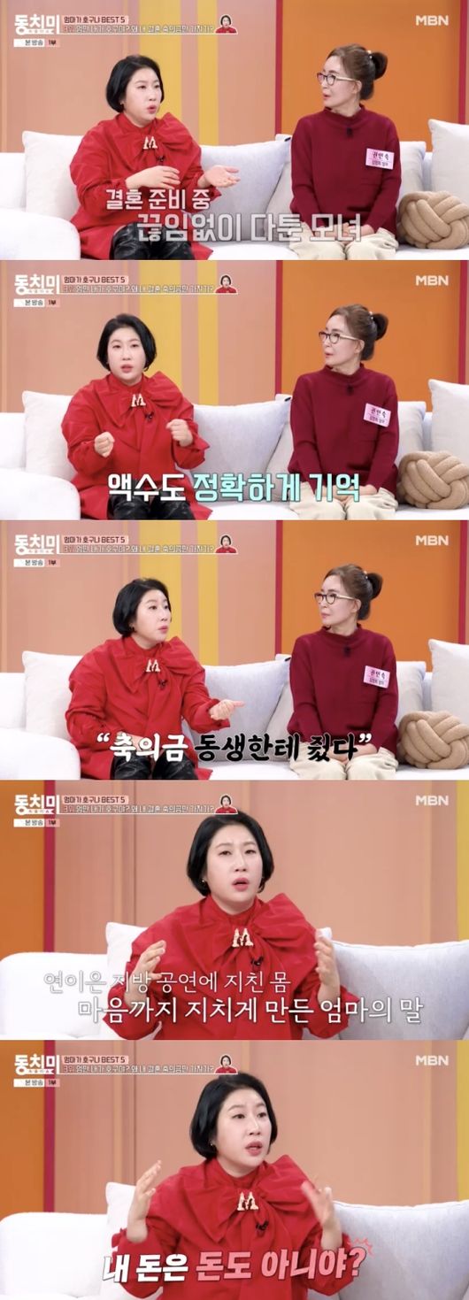 김영희는 “엄마가 돈 한 푼도 보태주지 않으셨다. 오기로 ‘밥솥 하나만 사줘’ 했다. 사줄 순 있지만 지금은 안 된다고 하더라. 그런데 축의금이 예상보다 많이 들어왔다. 엄마가 연락이 와서 ‘내 이름으로 온 축의금은 줘라’ 하더라”라고 말했다.