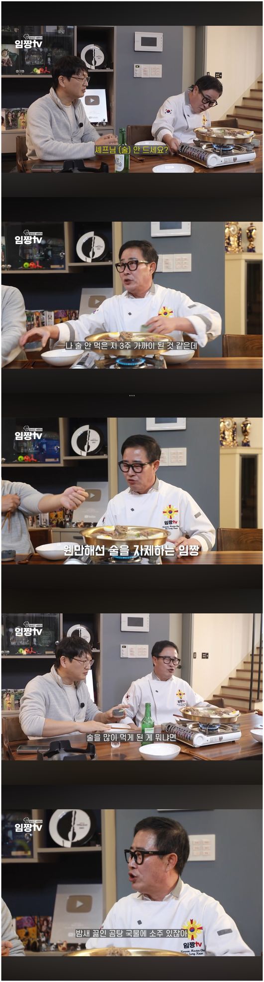 조리가 끝난 후 제작진과 음식을 나누어 먹으며 임성근은 술을 거절했다. 제작진은 “셰프님은 어릴 때 술 많이 드셨죠”라며 자연스럽게 물었다. 임성근은 “내가 술을 많이 먹게 된 게 뭐냐면 5시, 5시 반에 일어나서 도시 가스가 없으니까 연탄내가 칼칼할 때다. 밤새 끓인 곰탕 국물에 소주 있지 않냐. 일 끝나고 한 잔 마시는 거다”라면서 “지금은 술을 5~6년 전부터 조금 조심하죠”라고 말했다.