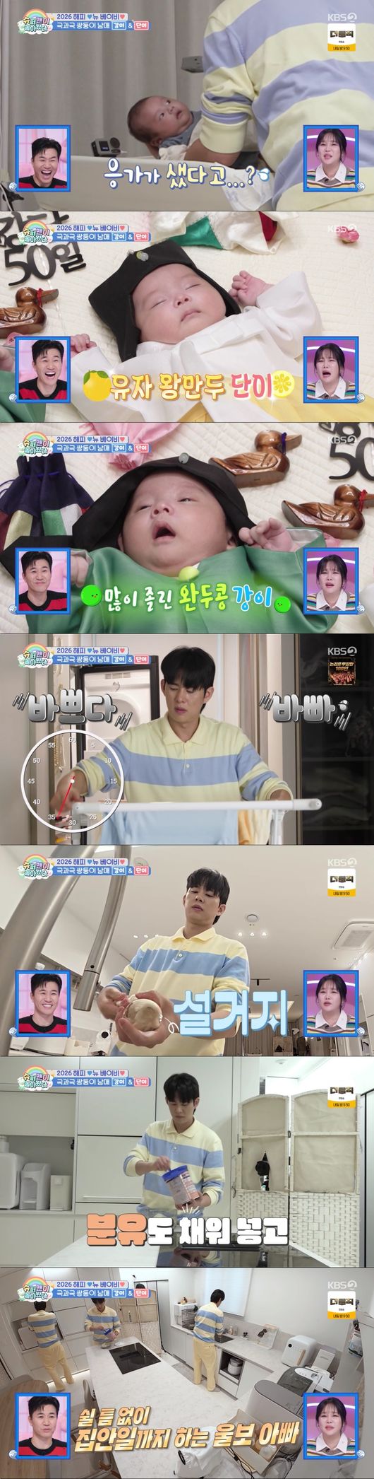 임라라·손민수 부부가 쌍둥이 남매 '강단이'를 위해 50일 기념 한복 사진 촬영에 나선 모습이 그려졌다. 이날의 관전 포인트는 아빠 손민수의 단독 육아 도전이었다. 스튜디오에서 이를 지켜보던 랄랄은 "아이들 옷 갈아입히는 게 정말 쉽지 않을 것"이라며 걱정 섞인 우려를 드러냈다.