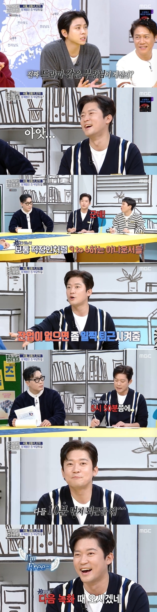 김대호는 "보통 스케줄이 없는 아나운서는 근무시간을 '9 to 6'를 지킨다"며 잔업 없으면 좀 일찍 퇴근 시켜준다고 했다. 이어 "보통 '남은 일 있어? 들어가~ 오늘 쉬어' 그렇게 한다. 근데 그때 5시 50분 쯤에 '아휴 인심 썼다. 다들 10분 먼저 퇴근들 해' 그러는 분들이 있다"고 폭로했다.