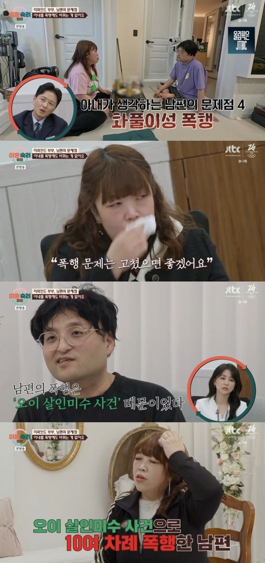 남편은 제작진과의 인터뷰에서 “위협하죠. 위협하고 그 때문에 아내가 힘들었다. 나도 힘들지만”라고 당당하게 말했다. 아내는 “자기 감정이 격해졌을 때 때린 적이 있다. 그런데 아무리 제가 잘못을 했다고 해도 사람을 때리면 안되지 않나. 그거는 고쳤으면 좋겠다”라고 토로했다.