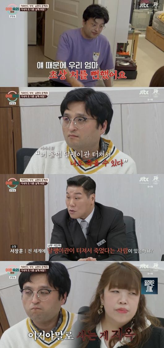 서장훈은 “전 세계에 달팽이관 터져서 죽었다고 한 사람 있냐”라고 황당해하며 “말도 안 되는 소리하면서 저렇게 성질내냐”고 다그쳤다. ‘죽음’이라는 무기로 아내를 끊임없이 몰아붙이는 남편이지만, 아내는 그래도 같이 살고 싶다는 입장을 고수했다.