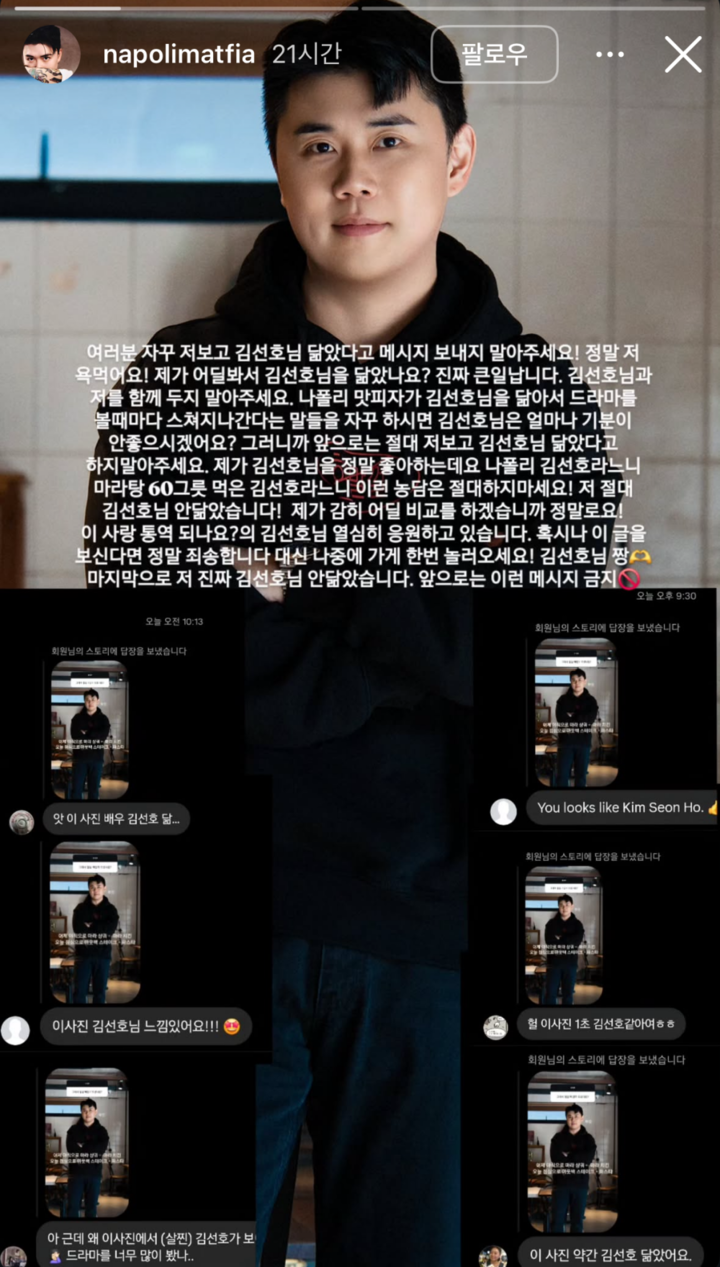 권성준 셰프는 지난 22일 자신의 계정을 통해 장문의 글을 올리며 팬들에게 당부의 말을 전했다. 그는 "여러분, 자꾸 저보고 김선호 님 닮았다고 메시지 보내지 말아주세요. 정말 저 욕먹습니다"고 말했다. 이어 권성준 셰프는 "제가 어딜 봐서 김선호 님을 닮았나요? 진짜 큰일 납니다. 김선호 님과 저를 함께 두지 말아 주세요"라며 닮은꼴설을 부인했다.