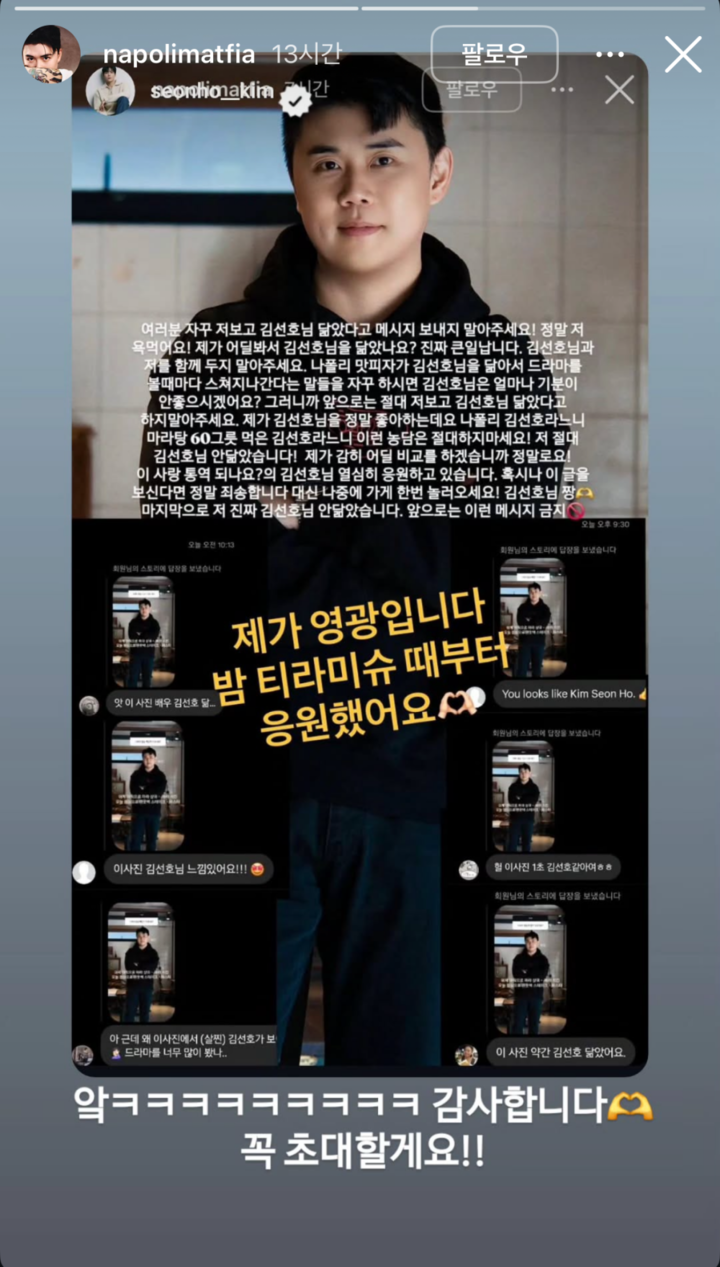 뿐만 아니라 김선호 출연작 '이 사랑 통역 되나요?'를 언급하며 "혹시 이 글을 보신다면 정말 죄송하다, 나중에 가게에 꼭 한번 놀러 와 달라"고 전했다.