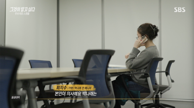 이날 박나래의 전 매니저 B씨도 인터뷰에 응했다. B씨는 3년간 박나래의 매니저로 일했고, 최근 박나래와 소송전을 진행하는 인물. 주사이모 의혹도 B씨로부터 본격적으로 제기됐다. B씨는 “그때가 김해 촬영분이었다. 그날 갑자기 호텔로 한 분이 오시는데 키도 작으시고, 정말 보통 중년 여성 분이었다. 누가봐도 의사는 아니었다. 그때 한번 봤고, 주사 꽂고 바로 가셨다”고 말했다. B씨는 그날 이후 김해에 온 주사이모를 본 적이 없다고.
