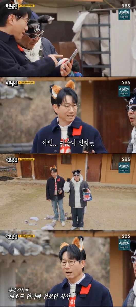 이 가운데 '런닝맨' 맏형 지석진은 주식 수익률 따라 꼬리도 ‘떡락’한 석삼이 돼 등장했다. 그는 '파란색' 일색인 주식 어플리케이션을 보며 한숨 쉬었다. 그의 수익률을 따라 꼬리털도 볼품 없이 빠져 있었다.