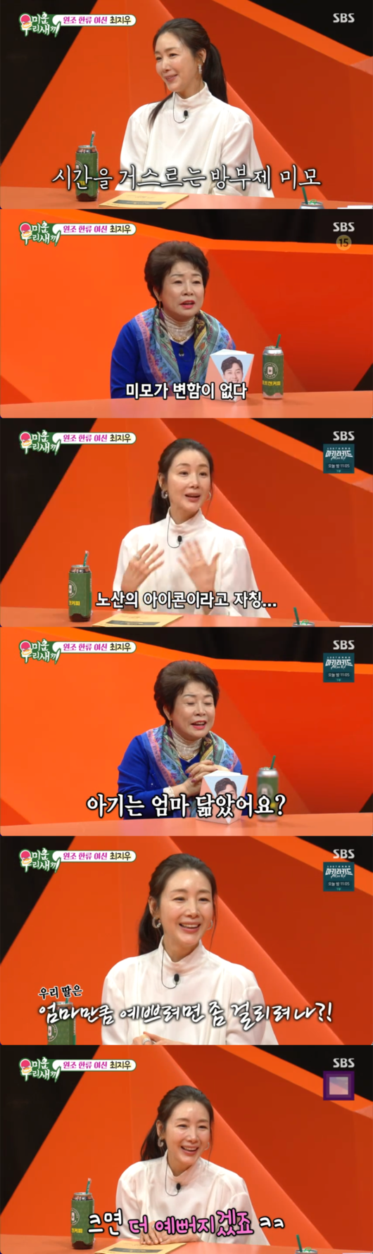 [OSEN=박근희 기자] '미운 우리 새끼’ 배우 최지우가 무려 46세에 첫 출산을 했던 비하인드 스토리와 함께, 딸의 외모에 대한 솔직하고 유쾌한 생각을 전해 웃음을 안겼다.