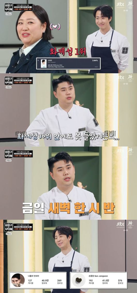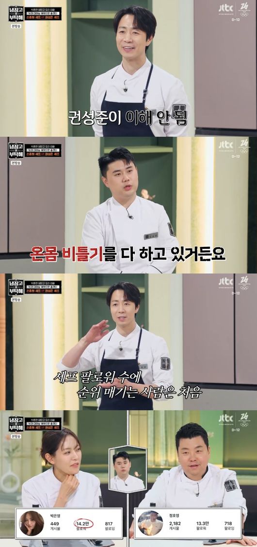 또 권성준은 휴대전화만 보다가 밤을 새웠다고. 그는 “제 질투의 대상이라서 이기고 있는게 딱 하나밖에 없었다. 제가 한국 요리사 중에 팔로워 수가 많았는데 오늘 새벽 1시 반에 손종원 셰프님이 1위로 역전하셨다”라고 털어놨다.