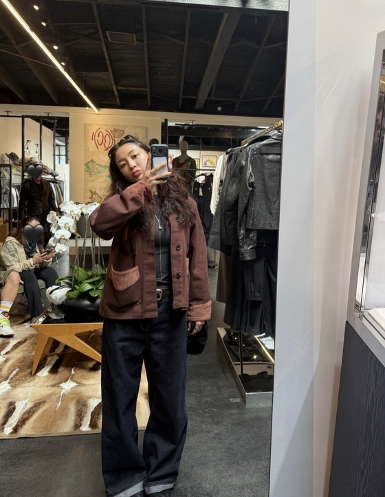다른 사진에서는 옷가게로 보이는 공간에서 캐주얼한 재킷과 통바지를 입고 자연스러운 포즈를 취하고 있다. 과한 연출 없이도 시선을 끄는 표정과 분위기가 돋보인다.