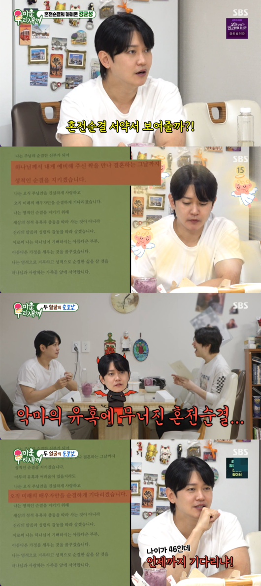 무엇보다 화제가 된 것은 과거 강균성이 선언했던 '혼전순결' 이야기였다. 김희철이 혼전순결 서약서 이야기를 꺼내자, 강균성은 2011년에 한 혼전순결 서약서가 있다며 직접 이를 보여주기 위해 자리에서 일어났다.