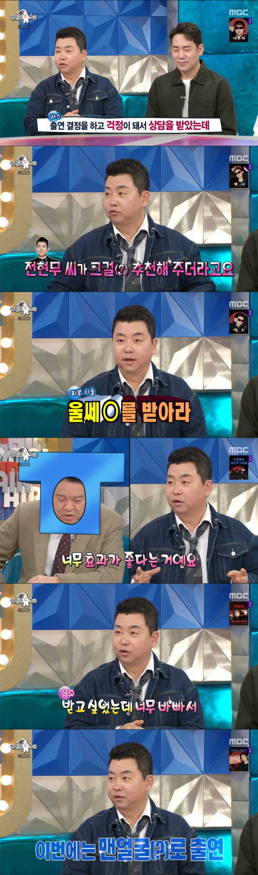 정호영은 “출연 결정을 하고 걱정이 돼서 상담을 받았는데 전현무 씨가 그걸 추천해 주더라고요. 울쎄X를 받아라. 너무 효과가 좋다는 거예요”라며 전현무식 ‘비주얼 관리’ 비법을 폭로했다.