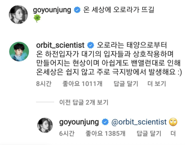 과학 전문 유튜버 궤도가 해당 게시물에 직접 댓글을 남기며 “오로라는 태양에서 온 하전입자가 대기와 충돌하며 생기는 현상”이라며 장문의 설명을 시작한 것.