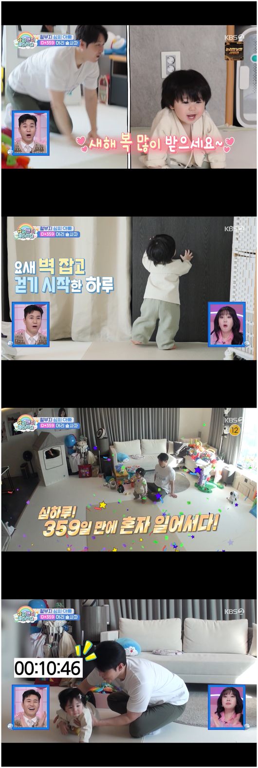 하루는 튼튼하게 건강하게 자라고 있었다. 또한 기어다니는 것과 다르게 벽을 짚고 일어나 모두를 놀라게 했다. 김종민은 “아빠 정말 뿌듯하겠다”라며 감탄했고, 심형탁은 “요즘 하루가 벽을 잡고 한 발짝, 한 발짝 움직이더라고요”라며 하루의 근황을 알렸다. 이날 하루는 무려 10초나 스스로 서 있어 심형탁을 또 한번 감탄하게 했다. 심형탁은 “어떻게 보면 자립 아니냐. 부모 마음이 이런 거구나, 싶었다”라면서 “이렇게 오래 서 있는 거 처음 봤다. 이 놈이 할 줄 아는데, 우리가 안 보이는 데서는 분명히 걸을 거다”라며 흥분했다.