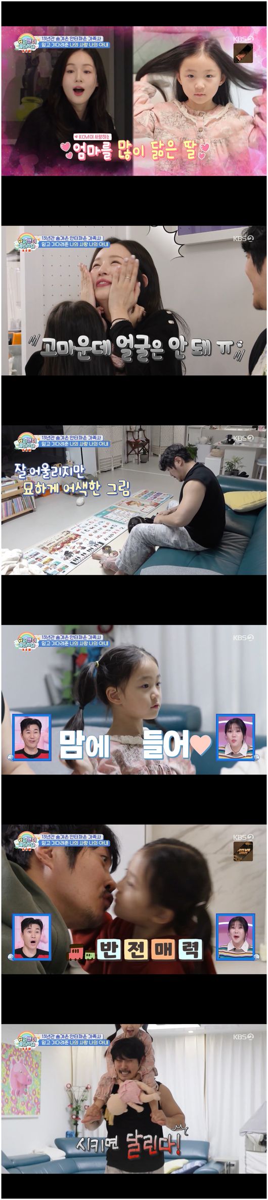 28일 방영한 KBS2TV 예능 ‘슈퍼맨이 돌아왔다’(이하 ‘슈돌’)에서는 아내에게 자상하고 딸에게는 행복함을 안겨주는 아빠 KCM이 등장했다. 그는 앞치마를 두르고 아침상을 차리며 아내에게는 오히려 "들어가 쉬어"라면서 둘째 딸 육아를 스스럼 없이 선보였다.