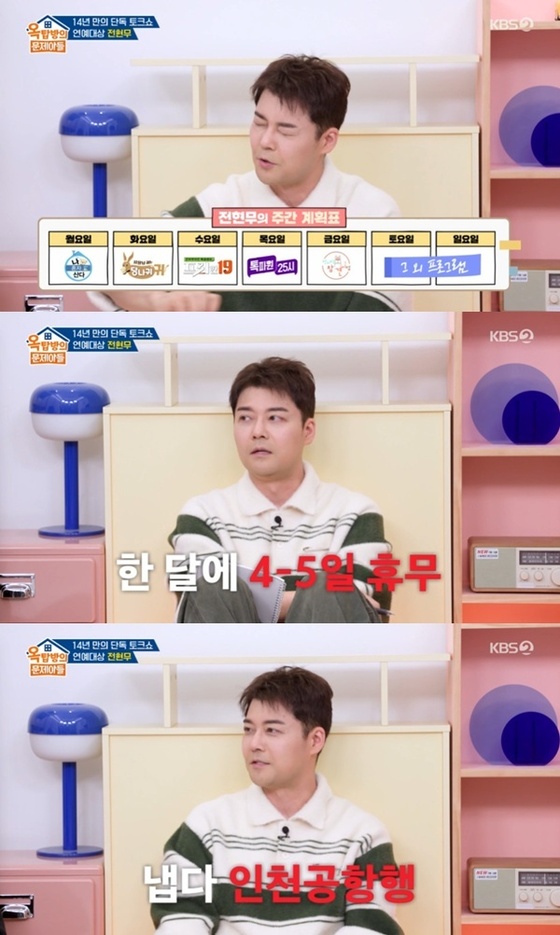 전현무는 '나 혼자 산다'부터 '사장님 귀는 당나귀 귀', '프리한19', '톡파원 25시', '전지적 참견 시점', '전현무계획' 등 일주일 내내 방송 촬영을 한다고 부연했다.