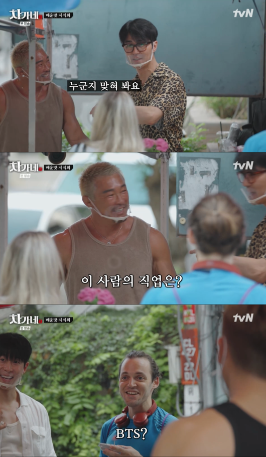 분위기를 이어 차승원은 추성훈을 가리키며 직업을 맞혀보라고 깜짝 퀴즈를 냈고, 돌아온 답변은 현장을 그야말로 초토화했다. 외국인 손님이 추성훈을 빤히 바라보더니 망설임 없이 “BTS”라고 답한 것.