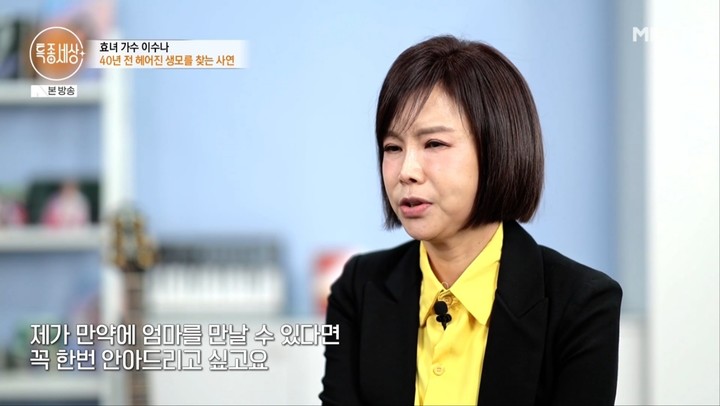 (MHN 박선하 기자) 가족을 위해 평생을 버텨온 트로트 가수 이수나가 가슴 속에 묻어둔 친엄마를 향한 그리움을 드러냈다.