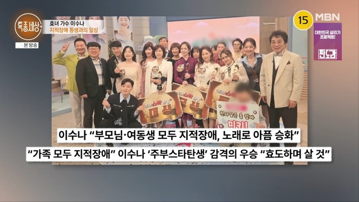 29일 방송된 MBN '특종세상'에서는 대한민국 대표 효녀 가수 17년 차 트로트 가수 이수나가 등장해 안타까운 사연을 전했다.