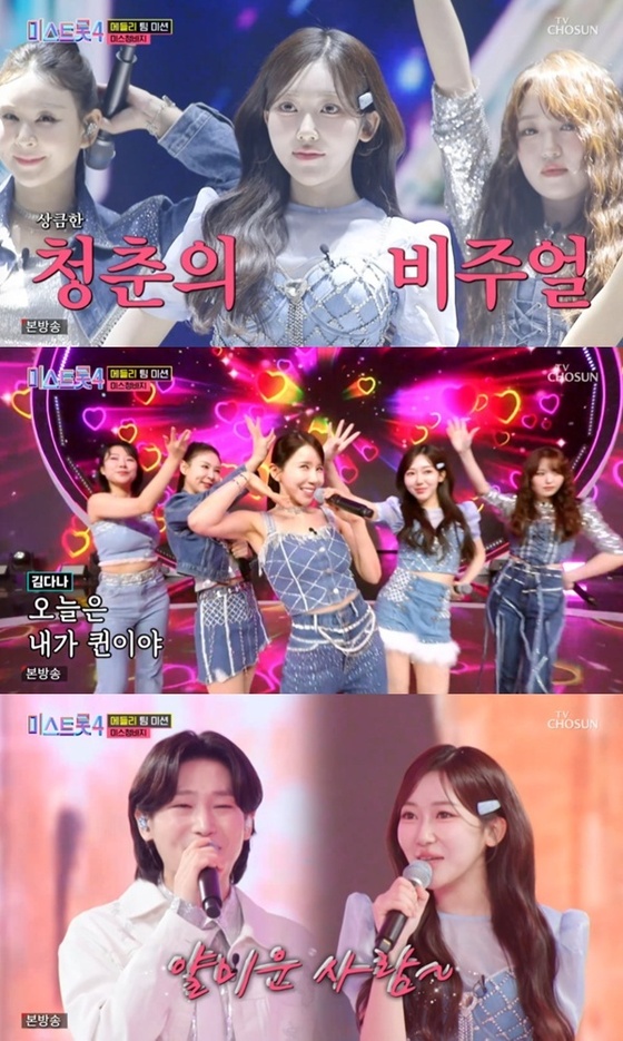 29일 오후 방송된 TV조선 예능 프로그램 '미스트롯4'에서는 본선 3차 메들리 팀 미션이 펼쳐졌다.본선 3차 팀 미션은 '미스 미스터 메들리 팀 미션'으로 진행, '미스터트롯3' TOP7 김용빈, 손빈아, 천록담, 춘길, 최재명, 남승민, 추혁진과 함께 무대를 꾸민다.