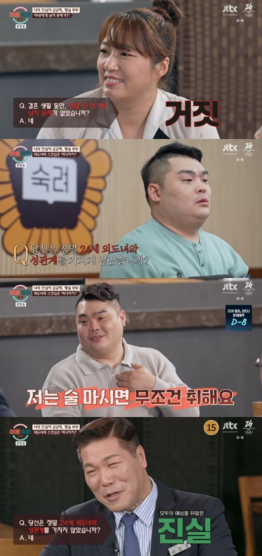 그러자 서장훈은 “안 잤으면 어떻게 되는 거냐”고 꼬집었고, 당황한 행실 남편은 “저는 술 마시면 무조건 취한다”라고 답을 회피했다. 그리고 결과는 모두의 예상을 뒤엎고 ‘진실’로 나와 반전을 안겼다. 아내는 내심 ‘진실’로 나오길 바랬던 만큼 남편의 입장이 진실로 밝혀지자 안도의 미소를 지었다.