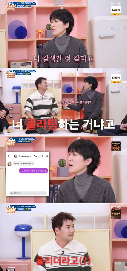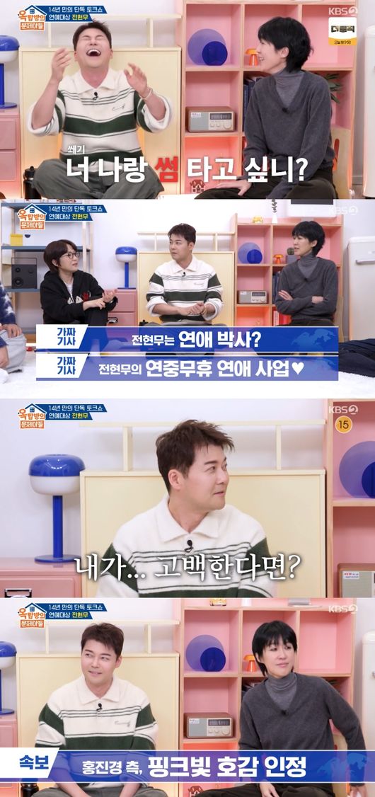 29일 방송된 KBS 2TV 예능 ‘옥탑방의 문제아들’에서는 단독 게스트로 전현무가 출연한 가운데 ‘동갑내기’ 홍진경과 핑크빛(?) 분위기를 자아냈다.