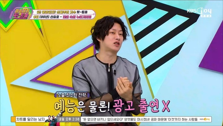 김희철은 "신승훈 형의 가장 유명한 일화는 단 한 번도 CF를 찍은 적이 없다는 것"이라며 "노래 외에는 예능이나 다른 프로그램 출연도 거의 하지 않았다. 특히 CF를 안 찍었다는 건 정말 대단한 일이다. 돈이 얼만데"라고 말해 웃음을 자아냈다.