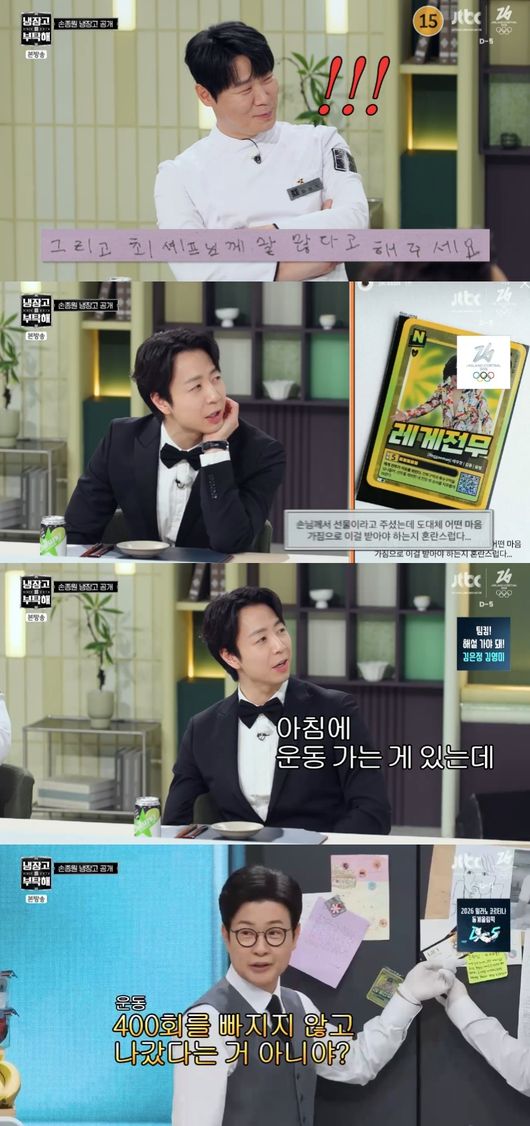 김성주는 “운동 400회 했다는 거냐”라고 물었고, 손종원은 “아침에 운동을 간다. 100회 될 때마다 티셔츠를 주거나 2주 체험권을 준다. 오늘 이기신 분한테 드리려고 갖고 왔다. 운동을 하셨으면 해서”라고 답했다.