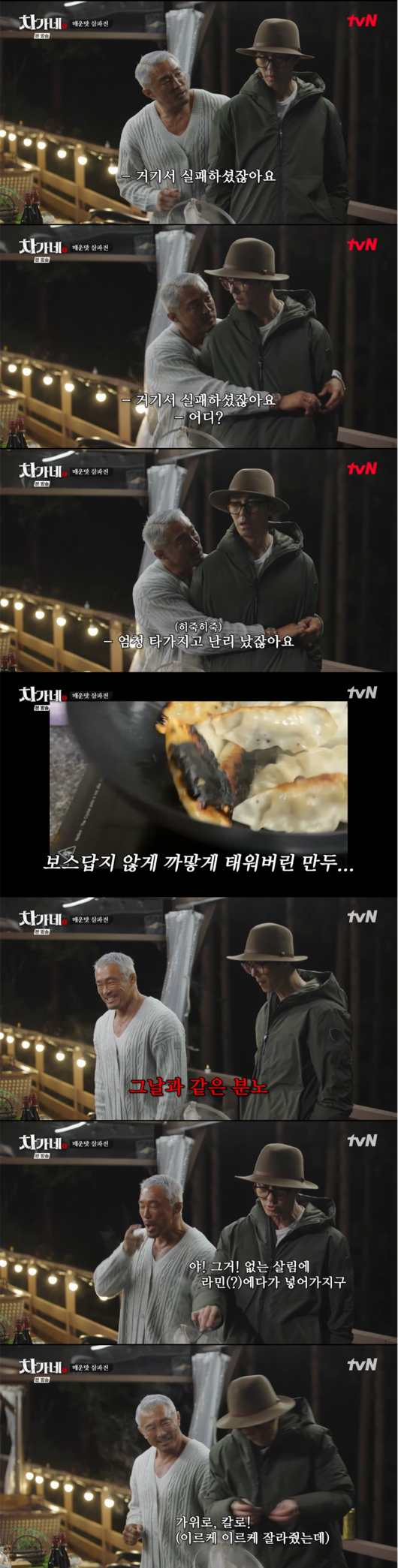 추성훈은 지난 태국 출장 당시 차승원이 요리 도중 만두를 새까맣게 태웠던 사건을 언급하며 “거기서 실패하셨잖아요. 엄청 타가지고 난리 났잖아요”라며 제대로 차승원을 '긁기' 시작했다. 당시 추성훈은 새까만 만두를 보며 “이걸 어떻게 먹냐”고 타박하며 차승원의 요리 자존심에 스크래치를 낸 바 있다.