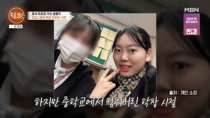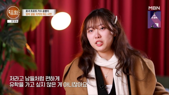 (MHN 박선하 기자) '천재 소녀'로 불리던 효녀 트로트 가수 송별이가 학업도 포기하고 엄마 곁을 지키고 있는 이유가 공개됐다.