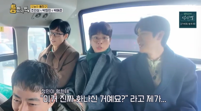 이어 "정민아 너 신발 미끄러지기 딱 좋다"고 하는 등 유재석은 박정민에게 계속해서 시비(?)를 걸며 새로운 애착 인형 다루듯 했다. 이에 박정민은 "저요? 저 때문인가요"라고 말하며 멋쩍게 웃었다.