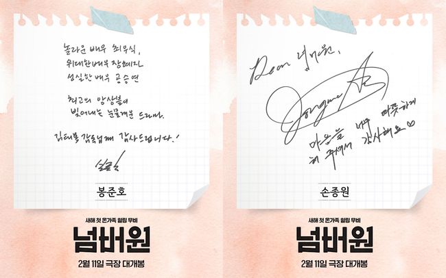 [OSEN=유수연 기자] 설 극장가 맞춤 유일한 온가족 힐링 무비 '넘버원'(감독 김태용, 제공 ㈜바이포엠스튜디오·펜처인베스트㈜, 배급 ㈜바이포엠스튜디오, 제작 세미콜론스튜디오·스튜디오더블엠, 공동제작 ㈜바이포엠스튜디오·아이피디컴퍼니)이 대한민국 대표 감독, 배우, 셀럽들의 감동과 애정이 듬뿍 담긴 친필 추천사를 공개했다.