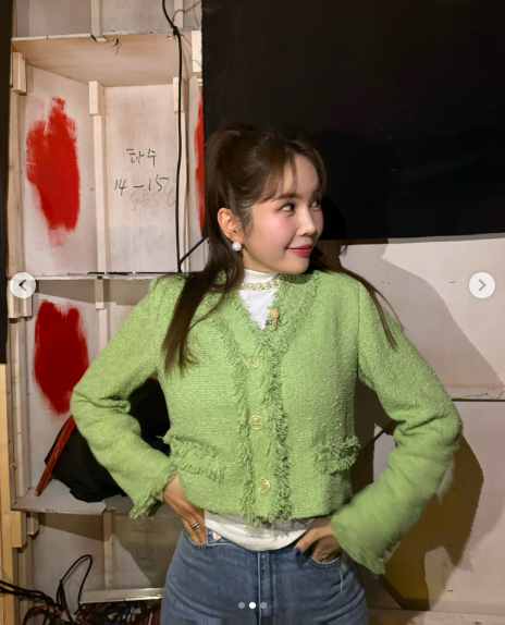 공개된 사진 속 장영란은 촬영 현장으로 보이는 공간에서 연두빛 트위드 재킷에 청바지를 매치한 캐주얼한 스타일을 선보였다.