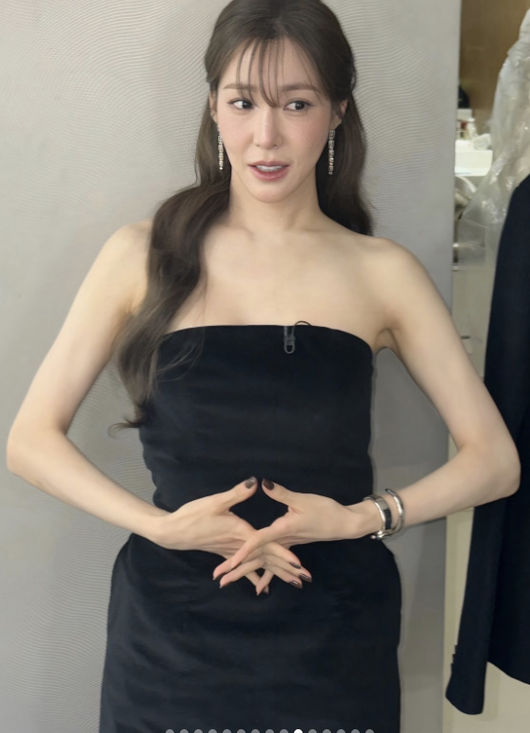 최근 공개된 사진 속 티파니는 블랙 튜브톱 드레스를 입고 세련된 분위기를 자아냈다.