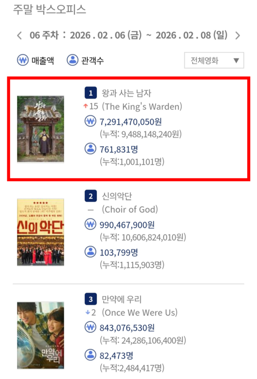 영화 '왕과 사는 남자'가 개봉 첫 주말 전체 박스오피스 1위에 등극했다. 영화진흥위원회 통합전산망에 따르면 영화 '왕과 사는 남자'는 2월 9일(월) 오전 7시 기준, 2월 6일(금)부터 2월 8일(일)까지 관객수 76만 1,831명을 기록하며 개봉 첫 주말 전체 박스오피스 정상에 올랐다.