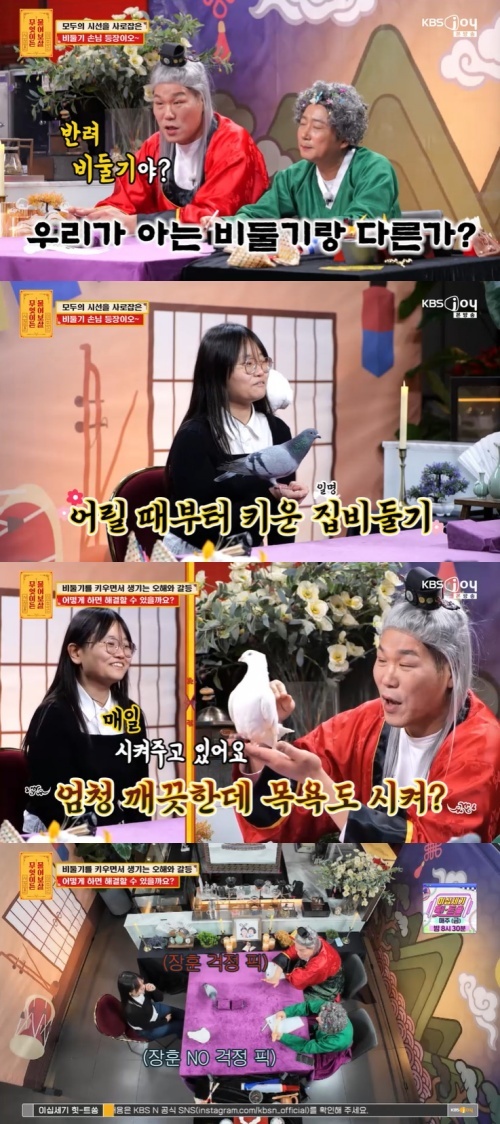 9일 오후 방송된 KBS Joy 예능 프로그램 '무엇이든 물어보살'에서는 앵무 비둘기, 바위 비둘기와 함께 사는 20살 여학생이 등장했다.