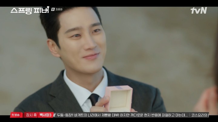 그리고 그는 천천히 무릎을 꿇고 반지가 담긴 상자를 꺼내 들며 "봄이 씨가 따지러 오면 주려고 계속 가지고 다녔다. 겨울처럼 찼던 내 마음에 따뜻한 봄이 되어준 봄이 씨, 앞으로도 추우나 더우나 봄이 씨 옆을 지켜드리는 남자가 되겠다"라고 다짐했다.